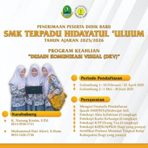 SMK Terpadu Hidayatul Uluum dirancang untuk mencetak lulusan yang memiliki keahlian spesifik di bidang teknologi dan bisnis, tanpa meninggalkan pondasi karakter Islami. Bagi lulusan SMP/MTs yang ingin melanjutkan pendidikan kejuruan, SMK Terpadu Hidayatul Uluum menawarkan program keahlian unggulan Desain Komunikasi Visual (DKV), mempersiapkan siswa menjadi kreator konten visual profesional masa depan.